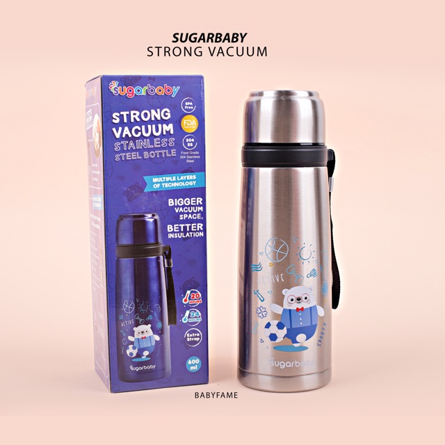 SugarBaby STRONG Vacuum Stainless Steel Bottle (600 ml) - Dark Blue- Menggunakan Stainless Steel 304 kualitas tinggi (food grade) dan anti karat- FDA Approved - BPA Free- Multiple Layers of Technology ( ada lapisan ganda stainless luar dan dalam, ruang hampa udara dan Extra Lapisan Tembaga sehingga mempunyai daya insulasi yang baik)- Memiliki ruang hampa yang lebih besar sehingga mempunyai daya insulasi termal lebih baik- Memiliki daya tahan panas lebih dari 20 jam*, dan dingin lebih dari 24 jam (*Suhu awal memakai air mendidih 98-100'C,jangan masukkan air panas dispenser karena hanya 70'C)✔Testing : 0 jam : 96-98'C, 6 jam: 78-80'C , 12 jam : 68-70'C, 24 jam : 53-55'C)- Memiliki Stopper khusus- Extra Strap cocok untuk dibawa berpergian.➡️Tersedia 2 warna :Dark Blue (Coco Bear) , Silver (Coco Bear)* Ukuran kemasan : 25,8 cm x 8,3 cm x 8,3 cm* Berat Bersih : 471 gr / Berat kotor : 535 gr* Berat pengiriman (hitungan volumetris) :