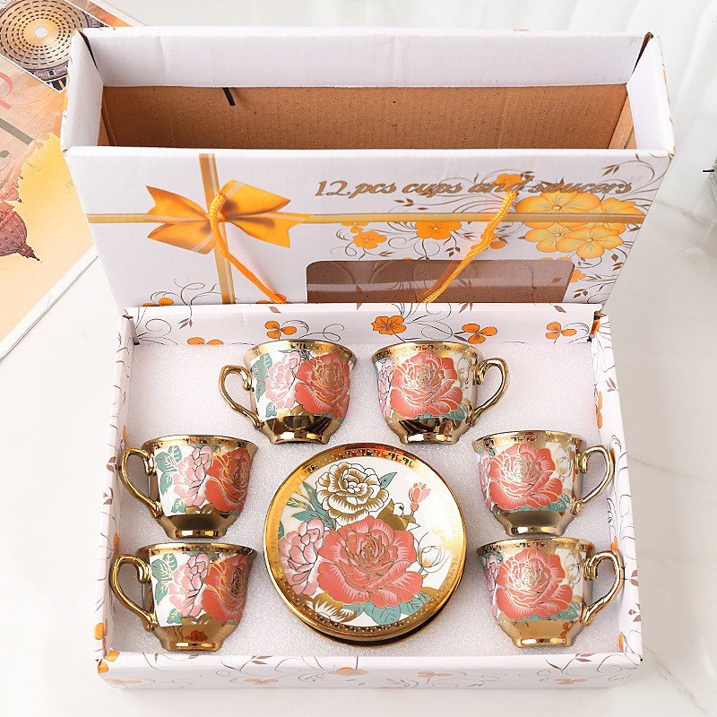 Cangkir Teh SetUkuran :- Kotak : 28.5*7.5*21cm- Piring : 10.5*10.5*1.8cm- Gelas : 8*6.5*5.5cmKapasitas : 50mlIsi: 6 Cangkir dan 6 Piring.#cangkirset #c