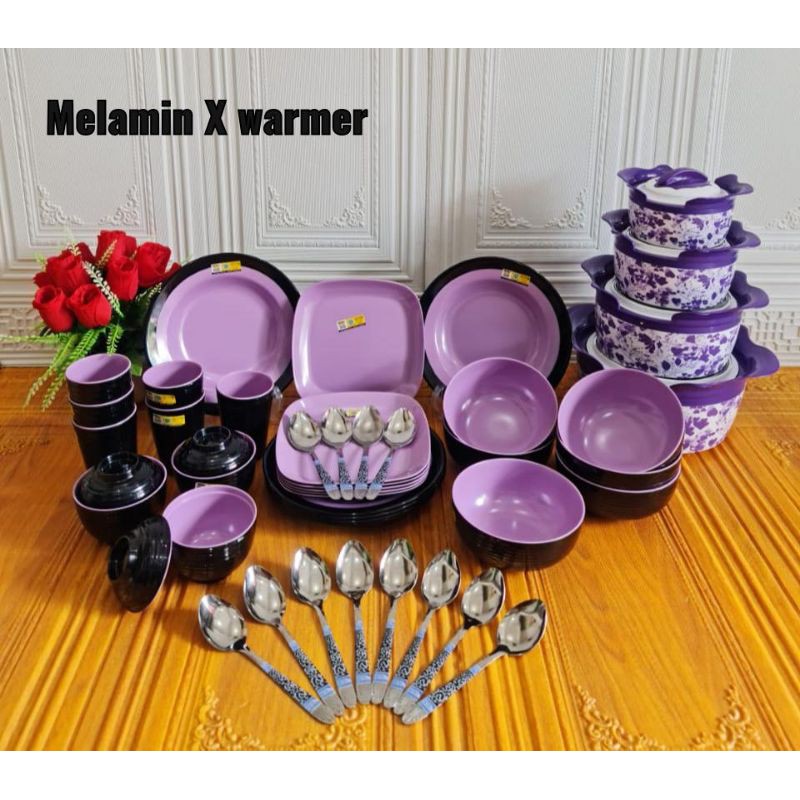 melamin. set lengkap seperti fto ya ka,30 pcs melamin+ Warmer set free sendok batik 1 lusinwajib atc buble/ packing kayu ya klo pingin aman